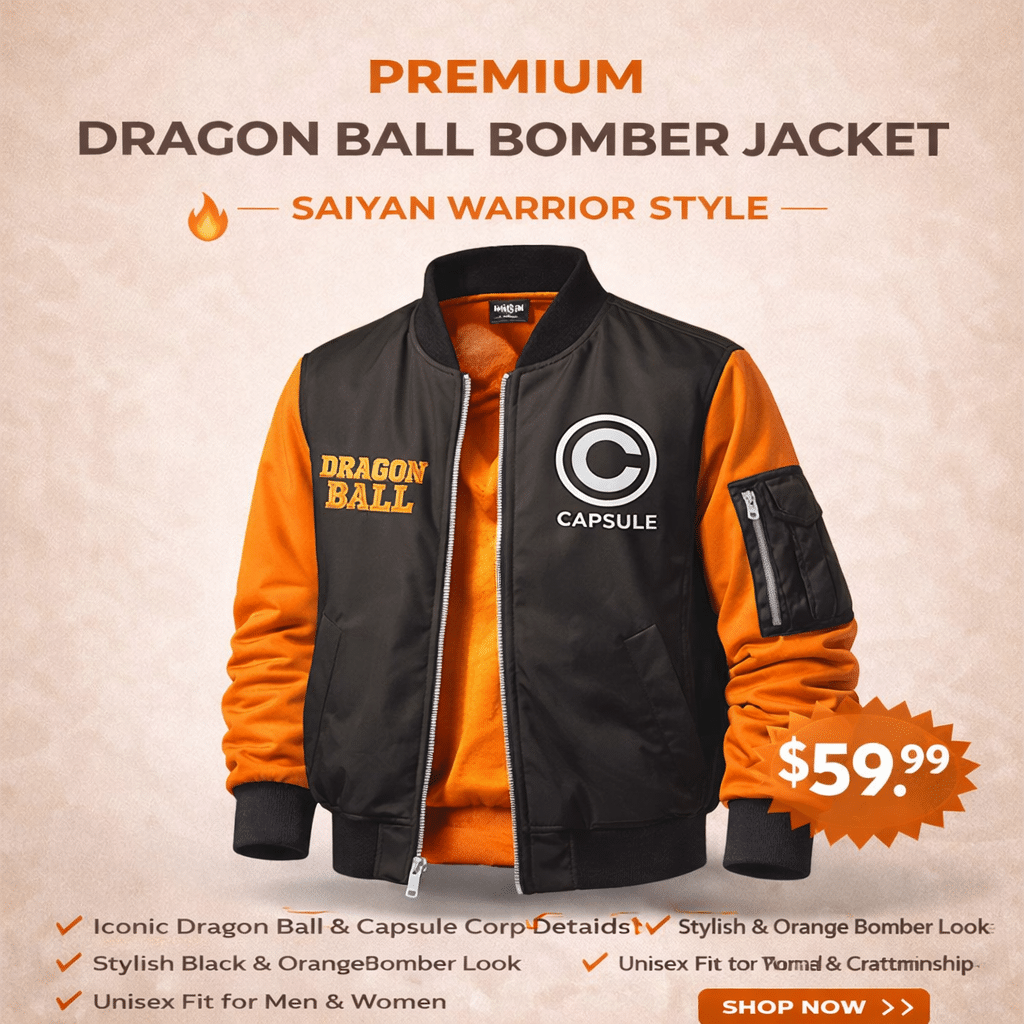 Take your style to the next level with this premium Dragon Ball bomber jacket. Built for fans who want a stronger, more stylish, and high-quality look inspired by true Saiyan warriors.
